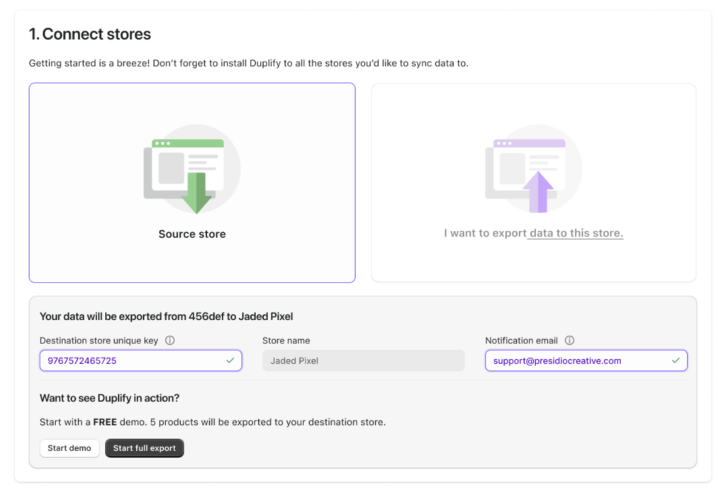 Duplify ist eine Shopify-spezifische Produktlösung zum Exportieren/Migrieren Ihrer Daten von Shop zu Shop.